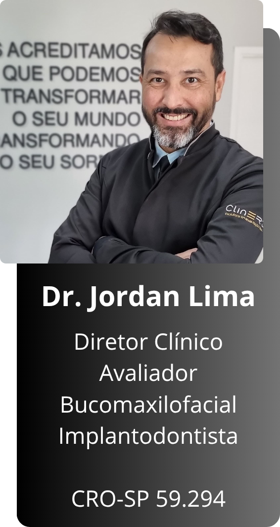 Com 27 anos de formação em Odontologia, sendo 23 deles dedicados à especialização, mestrado e doutorado em Cirurgia Buco Maxilo Facial, e 20 como especialista em Implantodontia, o Dr. Jordan Lima combina experiência clínica com um olhar humano e acolhedor.